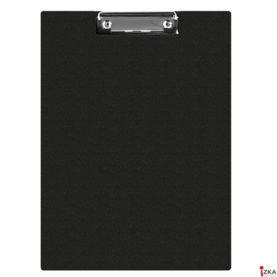 Podkładka do pisania z okładką, wykonana z tektury o grubości ok. 2mm_pokryta wysokiej jakości PVC_zacisk sprężynowy_posiada metalowy zacisk spinający do 30 kartek o gramaturze 70gsm_na wewnętrznej stronie okładki dodatkowa transparentna kieszeń na dokumenty oraz kieszonka na długopis lub ołówek_format: A5_rozmiar: 148x210mm_kolor czarny