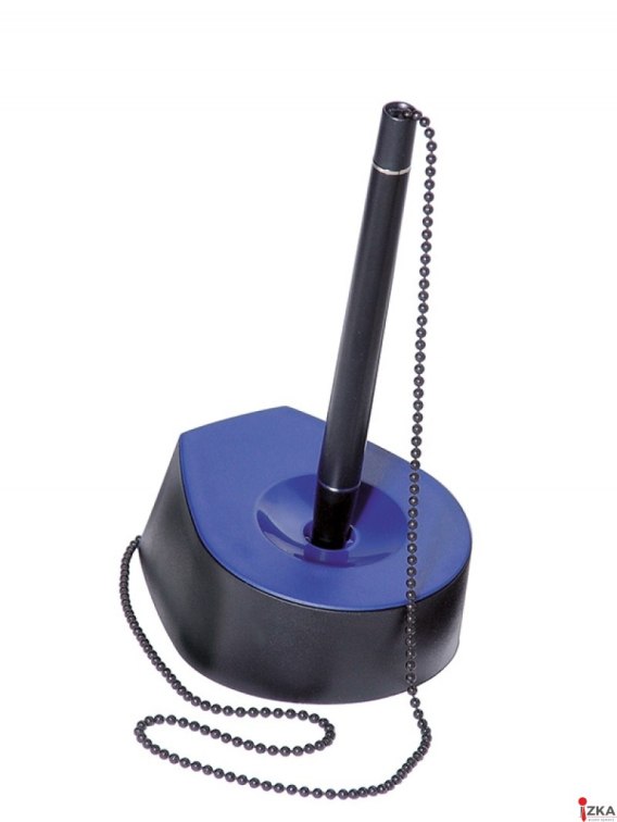 Długopis na łańcuszku, tusz na bazie oleju_wykonany z trwałego polistyrenu_stabilna, specjalnie dociążona podstawa_średnica kulki: 1mm_grubość linii pisania: ok. 0,47-0,50mm_długość linii pisania: ok. 3000m_długość łańcuszka: 55cm_średnica otworu: 11,4mm_wymiary podstawy: 68x95x40mm_kolor wkładu czarny_kolor czarno-niebieski