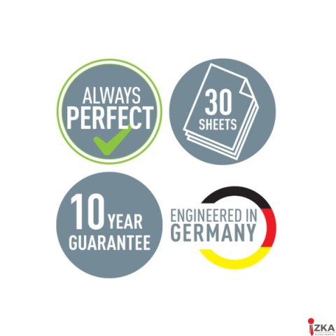 Dziurkuje do 30 kartek. Opatentowane elementy uchwytu perfekcyjnie dopasowujące się do dłoni i doskonałe ostrza zmniejszają wysiłek podczas dziurkowania. Minimalistyczne, uniwersalne wzornictwo, atrakcyjne kolory i matowe wykończenie.