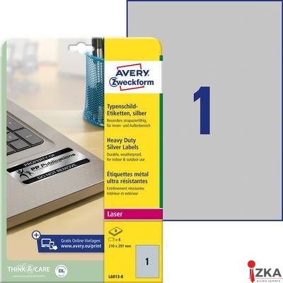 Technologia druku:•LASER: TakCechy produktu:•Rozmiar etykiety (mm): 210 x 297•Etykiet / arkusz: 1•Arkuszy/ opakowanie: 8•Etykiet/ opakowanie: 8•Kolor: srebrne•Format: A4•Rzędów/ arkusz: 1x1