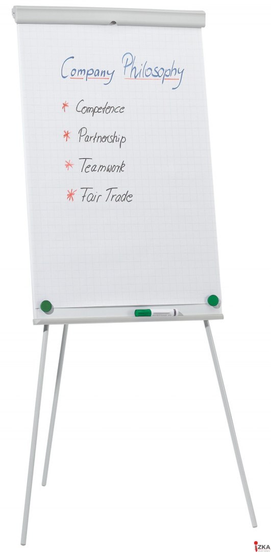 Flipchart z tablicą o powierzchni suchościeralno-magnetycznej_całość oparta na trójnogu_stelaż z regulacją wysokości max. 180cm_posiada zintegrowaną półką na artykuły piszące, co ułatwia pracę z flipchartem_posiada funkcjonalny uchwyt do mocowania papierowego bloku_rozmiar tablicy: 68x105cm_waga: 8kg