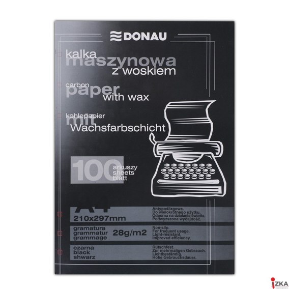 Jednostronnie powleczona masą barwiącą_ilość wyraźnych kopii wykonanych jednocześnie: 8-10 szt._ilość kopii z tego samego miejsca: min. 10 szt._gramatura: 18-19gsm kalka, 10gsm tusz_masa barwiąca zawiera specjalny składnik woskowy zapewniający właściwości samoregenerujące oraz możliwość wielokrotnego użycia_odbitki wykonane przy pomocy kalki maszynowej są odporne na działanie światła - nie wykazują żadnych zmian nasilenia barwy pod wpływem działania światła_okres przydatności do użytku: min. 12 miesięcy od daty produkcji_rozmiar: 210x297mm_100 sztuk w j.s._kolor czarny
