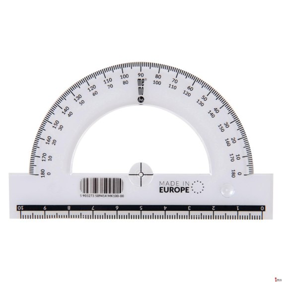 Kątomierz MemoBe by Pratel. Przezroczysty kątomierz 180 stopni. Posiada trwałą nieścieralną podziałkę. Zaokrąglone rogi zapewniają bezpieczeństwo użytkowania. Wykonany precyzyjny nadruk skali (do 0,001 cm). Wykonane z plastiku o odpowiednim stosunku twardości do elastyczności zapewniającym wysoką odporność na złamania. Wyprodukowany zgodnie z europejskimi normami.