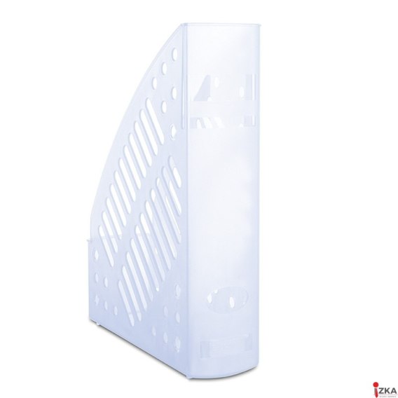 Pojemnik na dokumenty, ażurowy, wykonany z twardego, odpornego na pęknięcia polistyrenu_posiada Zielony Punkt (Der Gr_ne Punkt) - udział w systemie recyklingu i odzysku odpadów wynikający z przepisów prawa polskiego i UE_szerokość grzbietu: 70mm_pojemność: do 700 kartek o gramaturze 80gsm_sztywna konstrukcja o zwiększonej stabilności_ścięte boki ułatwiają wkładanie i wyjmowanie dokumentów_tworzywo przeznaczone do recyklingu_wymiary: 70x315x240mm_kolor transparentny niebieski