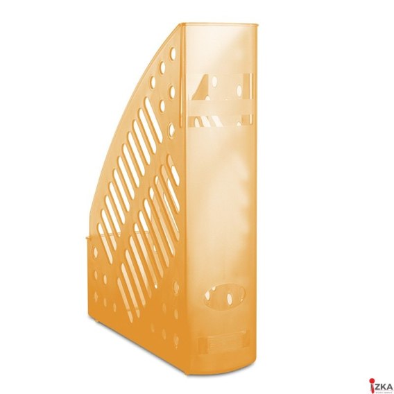 Pojemnik na dokumenty, ażurowy, wykonany z twardego, odpornego na pęknięcia polistyrenu_posiada Zielony Punkt (Der Gr_ne Punkt) - udział w systemie recyklingu i odzysku odpadów wynikający z przepisów prawa polskiego i UE_szerokość grzbietu: 70mm_pojemność: do 700 kartek o gramaturze 80gsm_sztywna konstrukcja o zwiększonej stabilności_ścięte boki ułatwiają wkładanie i wyjmowanie dokumentów_tworzywo przeznaczone do recyklingu_wymiary: 70x315x240mm_kolor transparentny pomarańczowy
