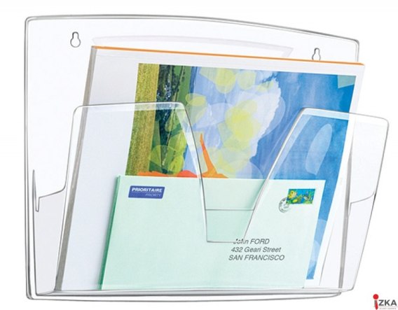 Zestaw półek przeznaczony na dokumenty w formacie A4, wykonany z odpornego na pęknięcia i odkształcenia polistyrenu_wewnątrz mieści ok. 300 kartek o gramaturze 80gsm o maksymalnym rozmiarze 24x32cm_duży kąt w kształcie litery V ułatwia wkładanie i wyjmowanie dokumentów_możliwość przechowywania większych formatów lub zrolowanych dokumentów (max. średnica 120mm)_mocowany za pomocą dwóch śrub - akcesoria do prostego i szybkiego montażu w komplecie_każdą półkę można zamontować oddzielnie_wymiary: 361x86x270mm_kolor przeźroczysty
