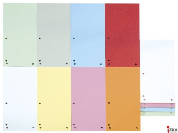Wykonane z kartonu o gramaturze 190gsm_posiada Zielony Punkt (Der Gr_ne Punkt) - udział w systemie recyklingu i odzysku odpadów wynikający z przepisów prawa polskiego i UE_posiada certyfikat Blauer Engel_do wpinania w pionie oraz w poziomie_dziurkowanie: 4 (dziurki w odstępie 80mm)_rozmiar przekładki: 235x105mm_100 sztuk w j.s._każdy komplet osobno pakowany w folię_mix kolorów