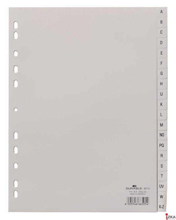Przekładki PP A4 szare, nadruk indeks, A-Z 20 części Szary 651310 DURABLE