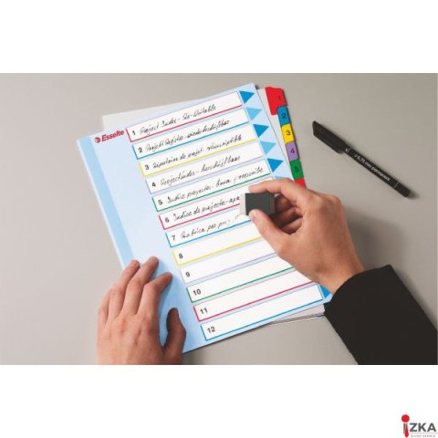 Przekładki Esselte z kartą do wielokrotnego opisu_- przekładki kartonowe MYLAR_- w formacie A4 Maxi (297 x 245 mm)_- idealne do dokumentów przechowywanych w koszulkach_- laminowana z dwóch stron karta informacyjna, można po niej pisać i wielokrotnie korygować napisany tekst, używając do ścierania tekstu plastikowej gumki_- do opisywania zalecane permanentne cienkopisy, markery lub długopisy kulkowe_- laminowane, kolorowe indeksy_- jednostka sprzedaży 1 komplet