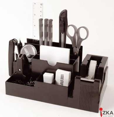 Przybornik Eagle 330 Przybornik na biurko z wbudowanym uchwytem do taśmy z obcinaczem. Wykonany z trwałego tworzywa w kolorze czarnym. Zawiera wyposażenie składające się z 13 elementów : zszywacz, rozszywacz, nożyczki, nóż do papieru, temperówka, linijka 15 cm, gumka do ścierania, długopisy (3 szt.), pinezki tablicowe (20 szt.), spinacze (30 szt.), zszywki _10 (1 op.), notes 2,5x3,5, taśma klejąca 12x10.