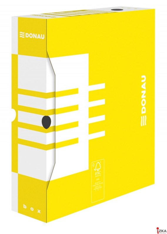 Wykonane z trójwarstwowej tektury falistej o gramaturze 390gsm_produkt bezkwasowy (pH ok. 7,5)_typ fali: B_pojemność: do 800 kartek o gramaturze 80gsm_pudełko mieści segregator lub jego zawartość_posiada 5 otworów ułatwiających układanie/wyjmowanie oraz 5 ścian opisowych_specjalny design umożliwia stawianie na krótszym lub dłuższym boku_certyfikat FSC_ gwarantuje, że surowiec potrzebny do produkcji wyrobu pochodzi z lasów zarządzanych w odpowiedzialny sposób; promuje on trwałą gospodarkę leśną opartą o najwyższe światowe standardy w dziedzinie ochrony przyrody i gwarantuje legalność pochodzenia surowca_format: A4_wymiary: 80x340x297mm_kolor żółty