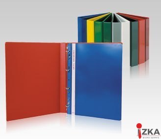 Wykonany z wysokiej jakości folii PCV z przezroczystymi kieszeniami na przedniej okładce i grzbiecie, które umożliwiają umieszczenie materiałów reklamowych. Wyrób wyposażony w mechanizm 4-ringowy w kształcie litery _D_. Szerokość grzbietu 5,5cm. Zamek umieszczony na tylnej okładce.
