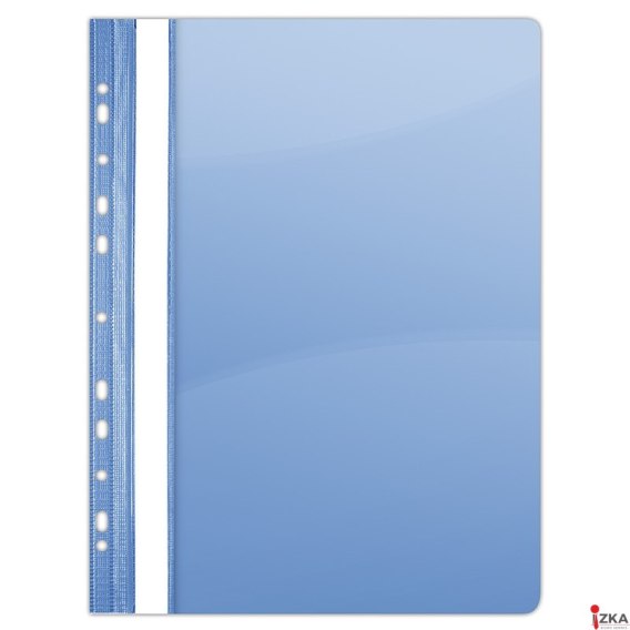 Wykonany z PVC, twardy_strona przednia transparentna - grubość: 150_m; tylna kolorowa: 160_m_mieści ok. 200 kartek_posiada 11 dziurek do wpięcia do segregatora_wymienny, dwustronnie zapisywalny pasek brzegowy_wąs o długości 16,5cm_format: A4_rozmiar: 235x310mm_kod kreskowy na każdej sztuce_kolor niebieski