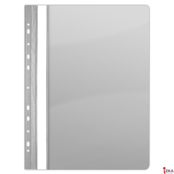 Wykonany z PVC, twardy_strona przednia transparentna - grubość: 150_m; tylna kolorowa: 160_m_mieści ok. 200 kartek_posiada 11 dziurek do wpięcia do segregatora_wymienny, dwustronnie zapisywalny pasek brzegowy_wąs o długości 16,5cm_format: A4_rozmiar: 235x310mm_kod kreskowy na każdej sztuce_kolor szary