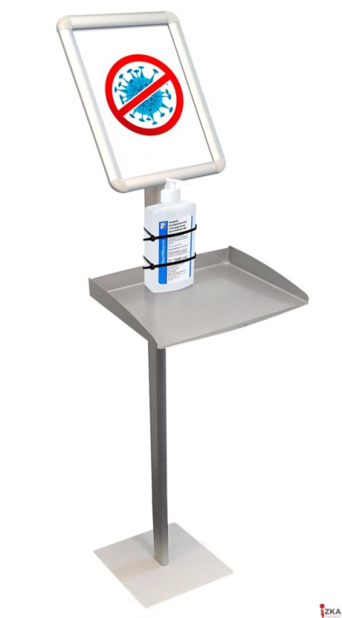 Stojak z ramką plakatową zatrzaskową i półką np. na płyn dezynfekcyjny.