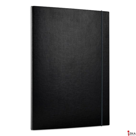 Teczka poszerzana, 3-skrzydłowa_wykonana z utwardzanego kartonu_pokryta ekologiczną folią PP o grubości 100 mikronów_wewnątrz biała okleina o gramaturze 115g/m2_pojemność: ok. 120 kartek o gramaturze 80gsm_zamykana okrągłą gumką wzdłuż teczki_gramatura tektury: 950g/m2_grubość tektury 1,5mm_szerokość grzbietu: 15mm_format: A4_kolor: czarny