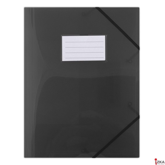 Wykonana ze sztywnego ekologicznego polipropylenu o grubości 480_m_3-skrzydłowa, półtransparentna_w delikatne prążki_zamykana za pomocą 2 płaskich, narożnych gumek w kolorze teczki z kieszonką i wymienną etykietą_rozmiar wewnętrznej kieszonki: 94x56mm_format: A4_rozmiar: 245x315mm_kolor czarny